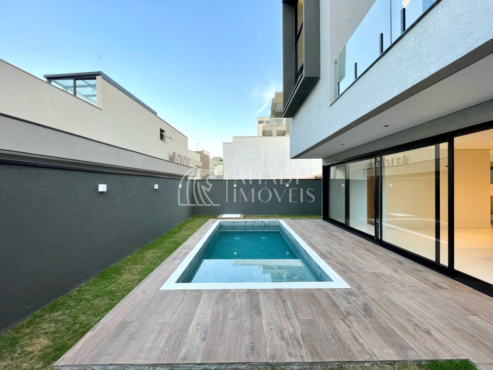 Área gourmet espaçosa que permite receber muitos convidados com churrasqueira e piscina cercada por jardim.