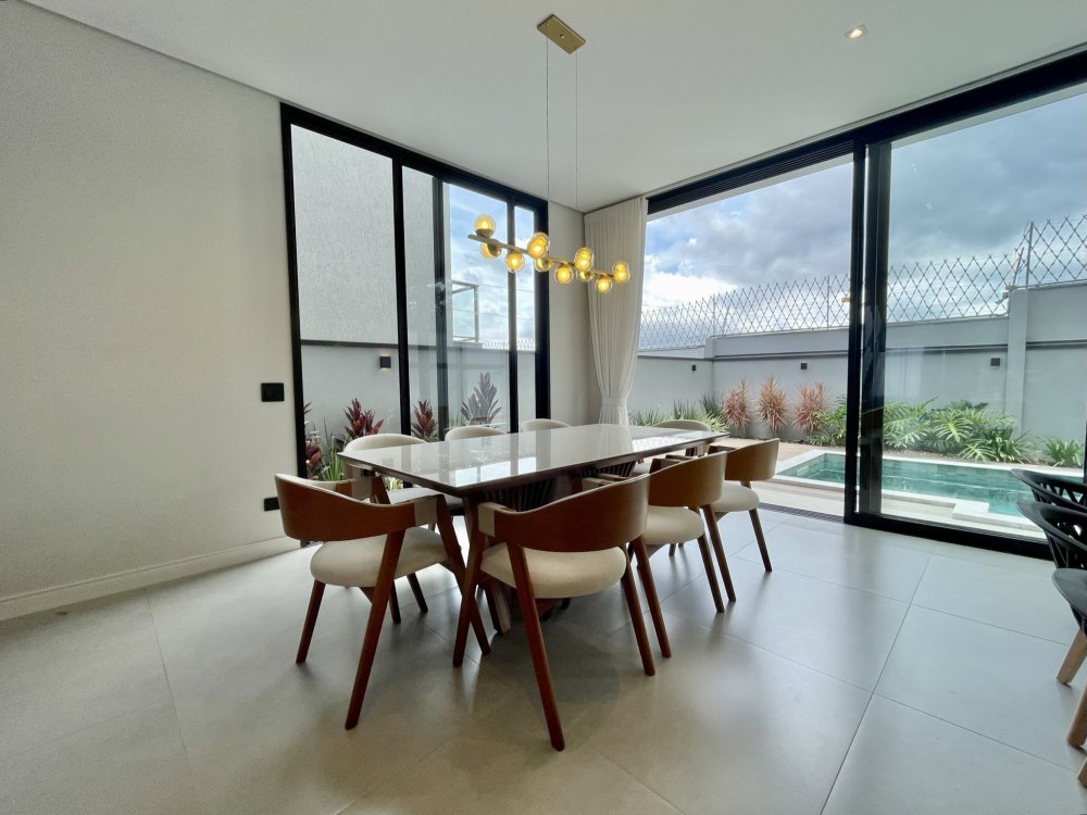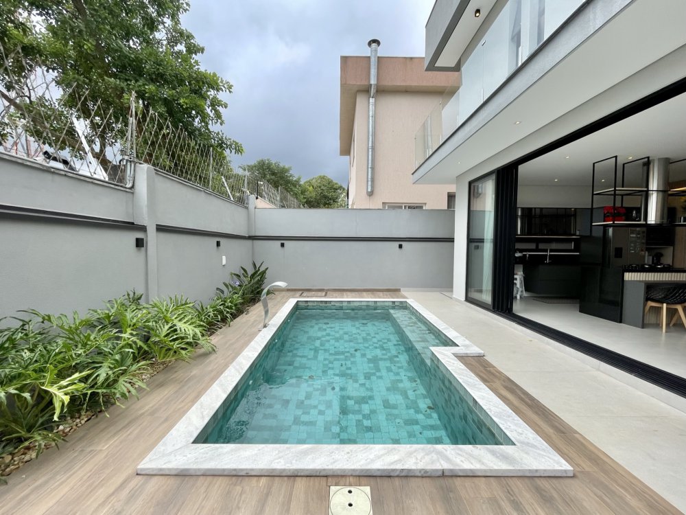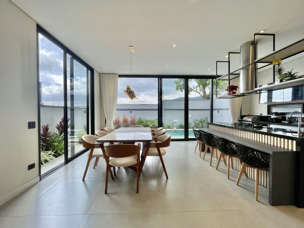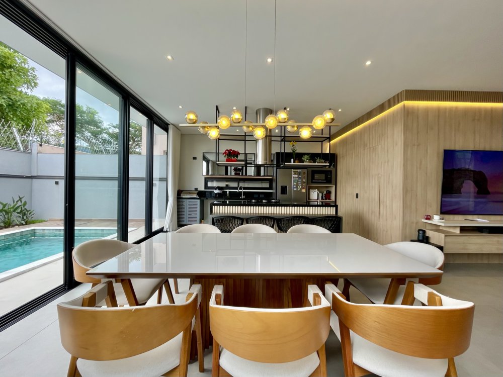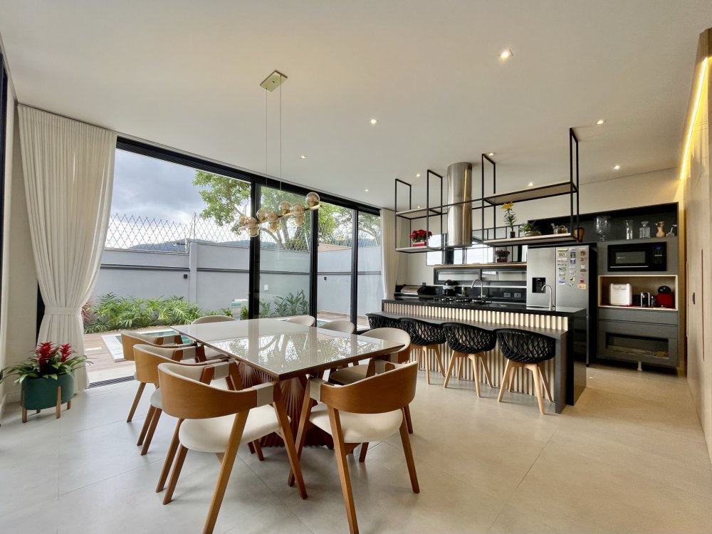 Sala ampla integrada a sala de jantar e área gourmet, ótima iluminação natural, piscina com hidro e cascata, três suítes sendo uma delas com closet amplo, e a outra master com closet e banheira.